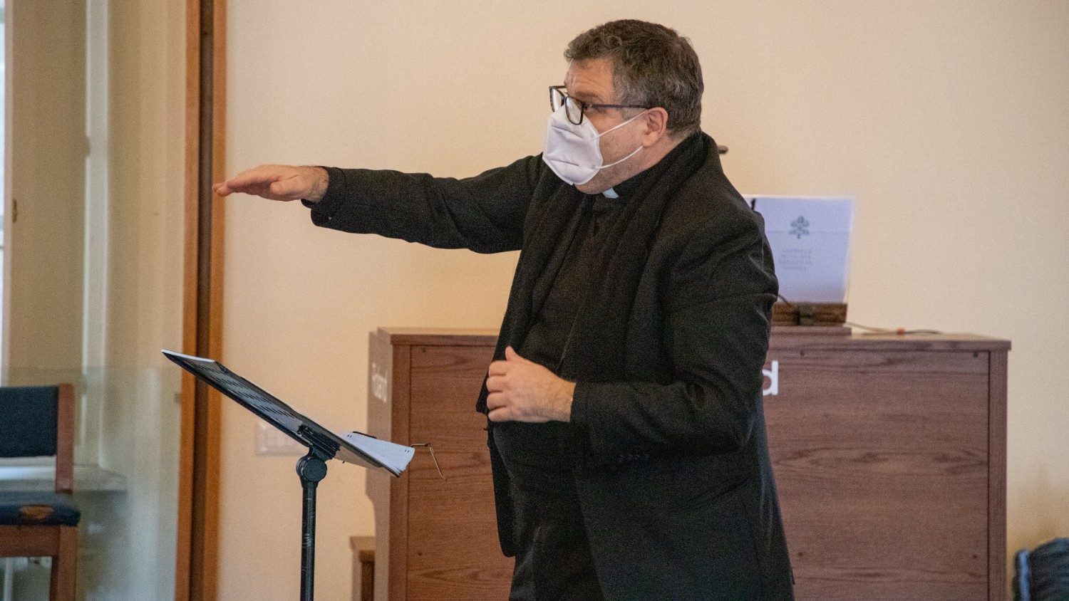 Ao final do ensaio, Mons. Pavan concedeu uma entrevista em que fala das origens do coral e de alguns aspectos técnicos da escolha do repertório. Ele explica, por exemplo, que a preparação é feita com o mestre das celebrações litúrgicas, Mons. Guido Marini, e de acordo com o caráter da festa.